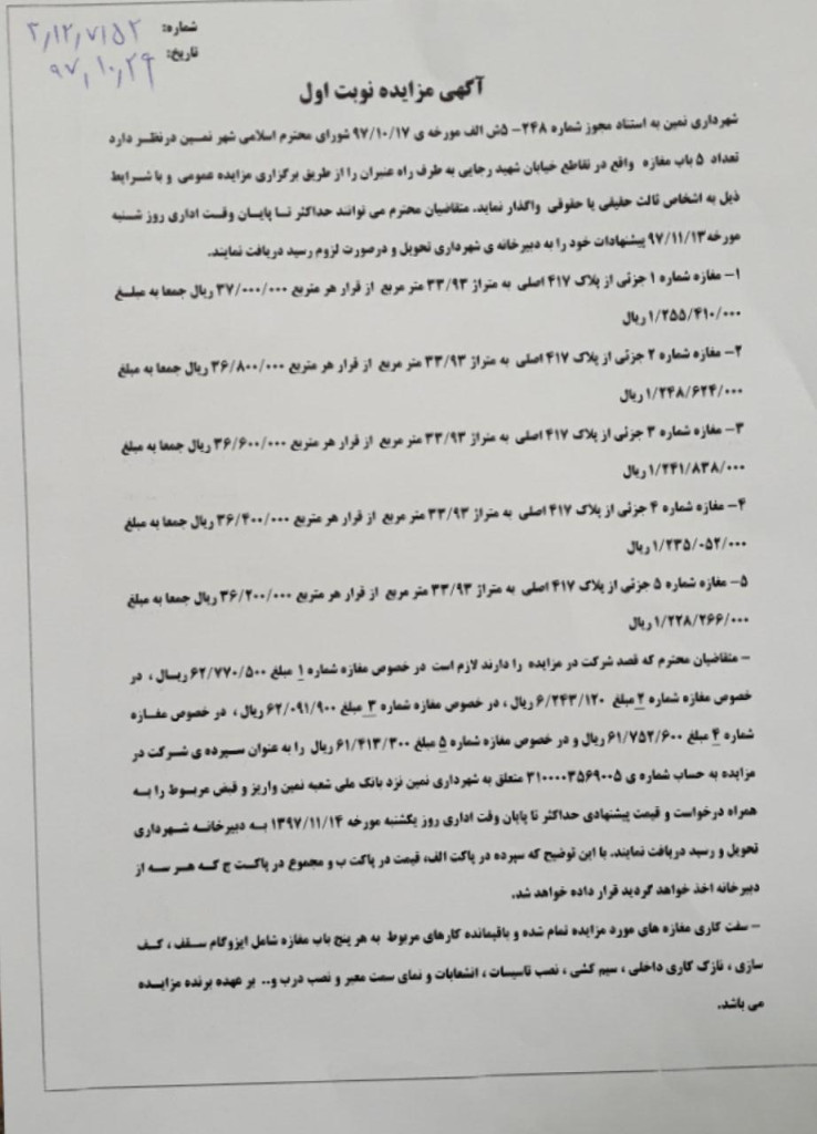 ۱۳۹۷-۱۰-۳۰ ۱۳۹۷-۱۰-۳۰آگهی مزایده نوبت اول شهرداری نمین – واگذاری ۵ باب مغازه در تقاطع خیابان شهید رجایی
