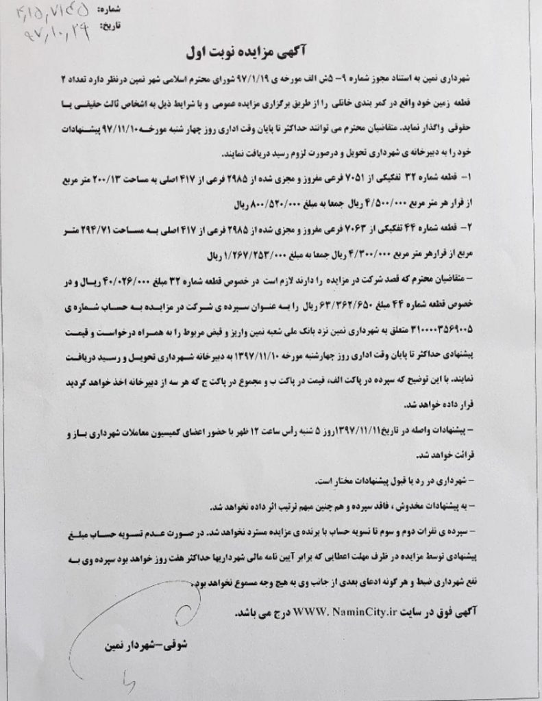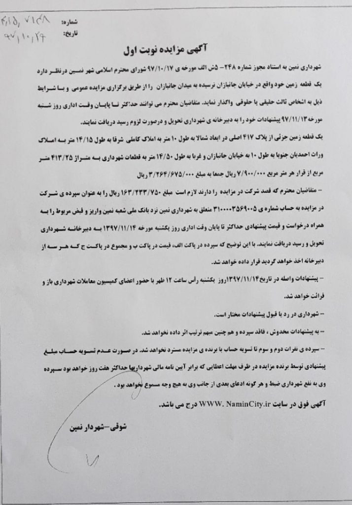 آگهی مزایده نوبت اول واگذاری ۶ قطعه از قطعات مسکونی واقع در بلوار فرهنگ جنب ساختمان ایران خودرو علاقمندان جهت کسب اطلاعات بیشتر و ملاحظه موقعیت […]